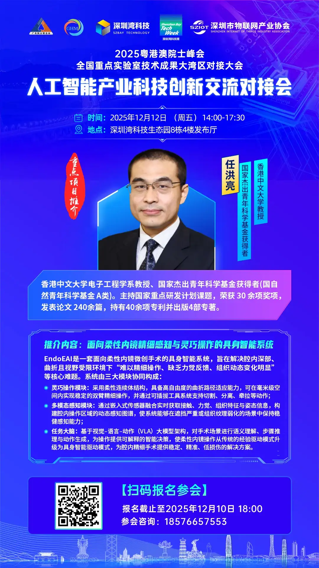 2025年12月12日,由深圳市物联网产业协会等单位承办的人工智能产业科技创新交流对接会即将召开,我们有幸迎来了重量级嘉宾——香港中文大学电子工程学系教授、国家杰出青年科学基金获得者任洪亮先生。