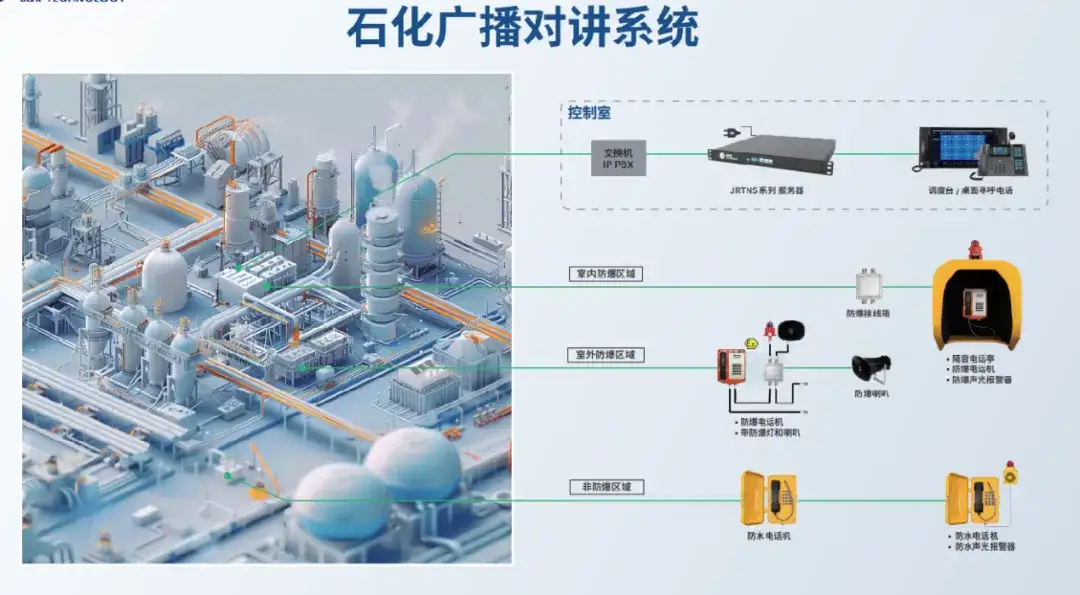 东方骏科(J&R)构建了“统一平台+场景适配+联动协同”的一体化架构:通过工业级IP网络服务器打通控制室、办公区、防爆区、高噪声区等全场景终端,将扩音对讲、应急广播、报警联动等功能集成一体,既满足了日常生产调度的高效性,又保障了应急处置的及时性。这种“全域覆盖、全链路贯通”的设计,改变了传统石化通信“分散化、碎片化”的格局。