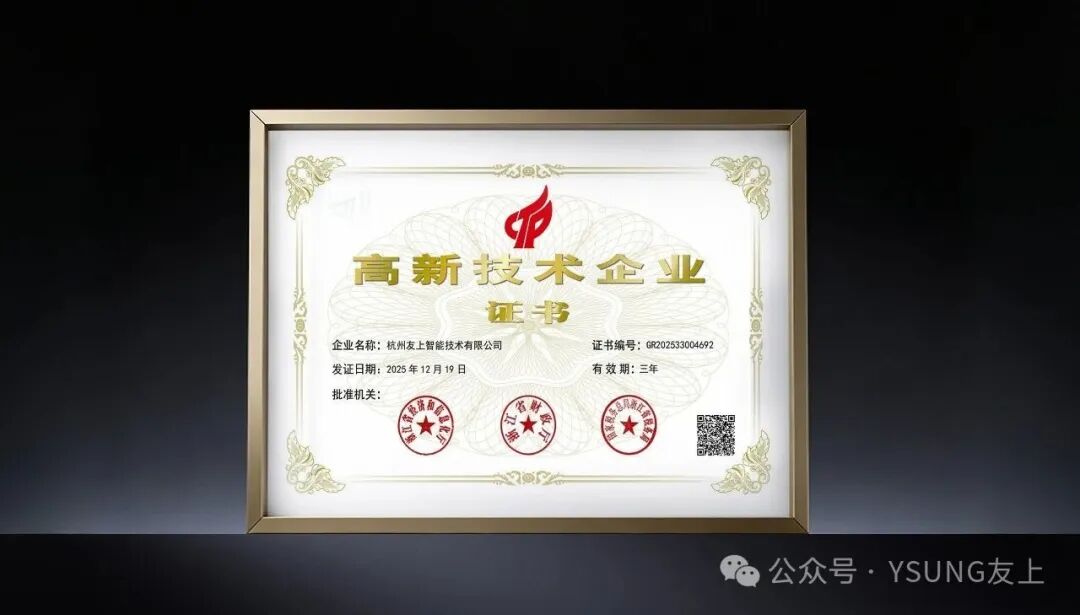 摘要:近日,杭州友上智能技术有限公司(YSUNG 友上)凭借在智能技术领域的深厚积淀、持续的研发创新能力及卓越的市场转化成果,成功通过国家高新技术企业认定,正式斩获高新技术企业证书!这一权威认证,是对友上智能技术实力、创新潜力与发展前景的高度认可,更是企业自 2016 年成立以来深耕制造业数字化转型赛道,迈向高质量发展新征程的重要里程碑。